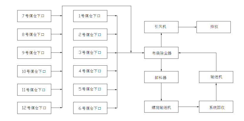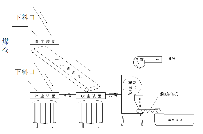 收塵系統(tǒng)整體布局采用集中風(fēng)網(wǎng)設(shè)計,12個煤倉下料口及帶式輸送機頭、尾均布置收塵裝置,集中匯集進布袋除塵器當中過濾,粉塵顆粒通過卸料器進入螺旋輸送機,螺旋輸送機把粉塵顆粒送進集中回收站里。